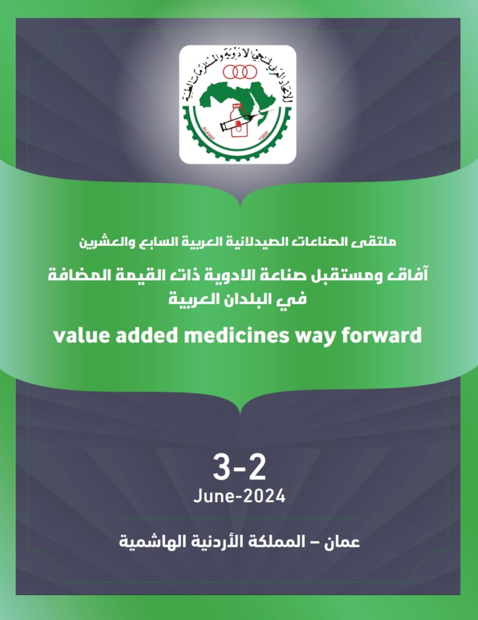 ملتقى الصناعات الصيدلانية العربية السابع والعشرين تحت عنوان “آفاق ومستقبل صناعة الادوية ذات القيمة المضافة في البلدان العربية” وذلك يومي 2-3 تموز 2024 في عمان المملكة الاردنية لهاشمية.
